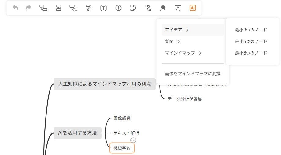 自動マインドマップ生成機能は、ユーザーがマインドマップに選択したノードの内容をテーマとして、自動的にアイデア、質問やマインドマップを生成する機能です。生成可能なノードは最小3つで最大8つです。この機能により、ユーザーは作成中のマインドマップのテーマについての情報やアイデアを簡単に取得し、手動でマインドマップを作成する手間も省くことができます。