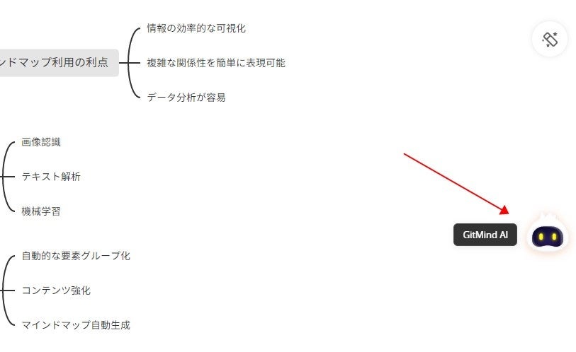AIアシスタント機能は、ユーザーがマインドマップを作成する際に、マインドマップ画面の右端にあるロボットのようなアイコンをクリックすれば、AIアシスタントとのチャットボックスが表示され、AIに知りたい情報を聞き出すことができます。もちろん、マインドマップの作成に必要な情報だけでなく、マインドマップを作成する必要がない時も、ChatGPTのようなチャットロボットとして利用できます。