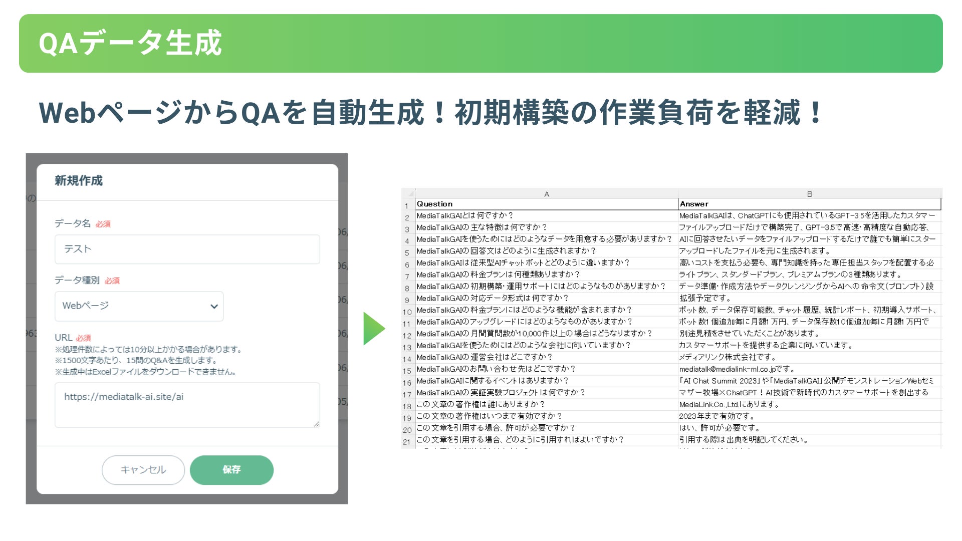 1.QAデータ生成機能:WebページからQAを自動生成することで初期構築の作業負荷を軽減します。
