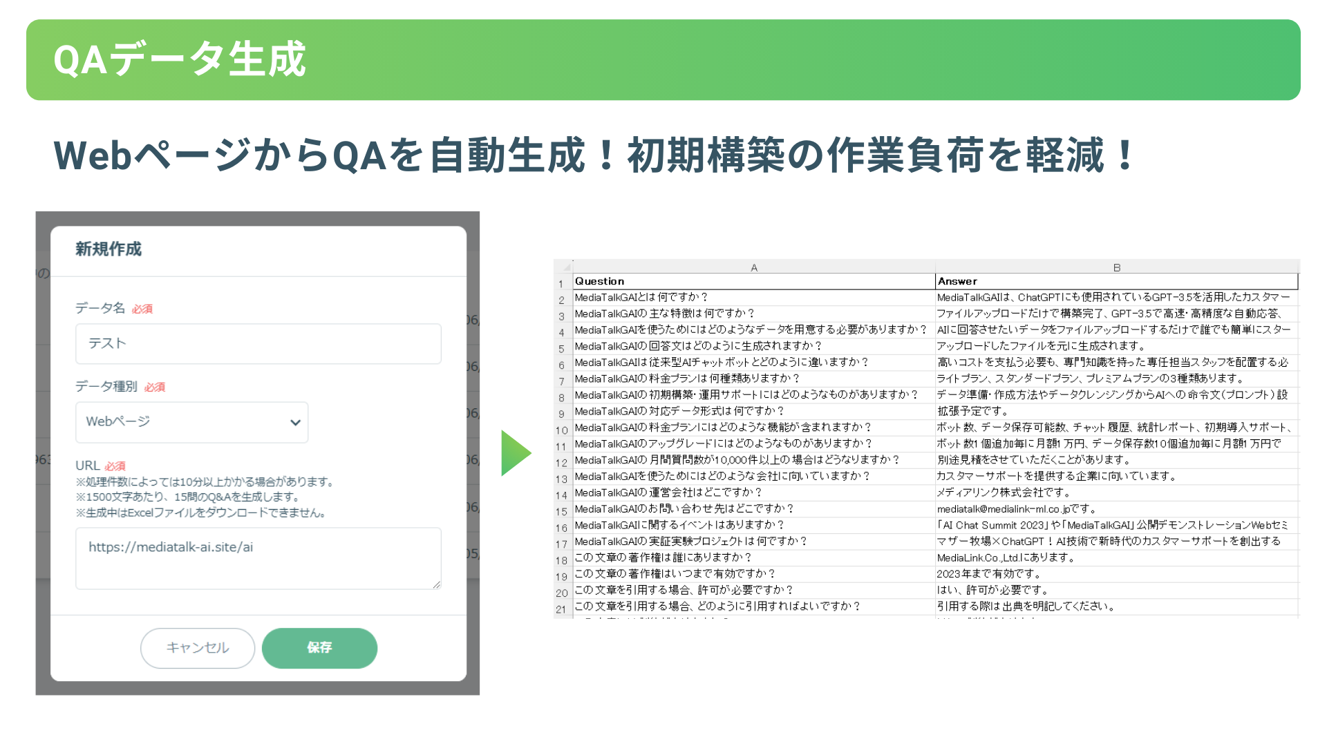 1.QAデータ生成機能:WebページからQAを自動生成することで初期構築の作業負荷を軽減します。