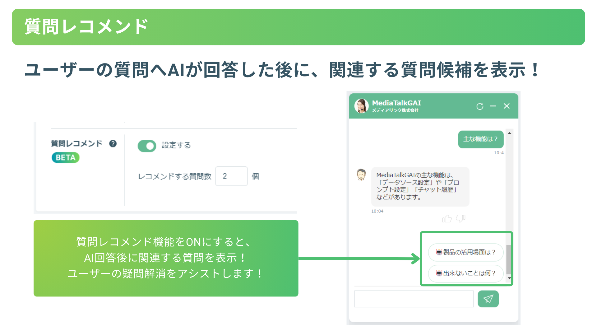 4.質問レコメンド:ユーザーの質問へAIが回答した後に、関連する質問候補を表示できます。