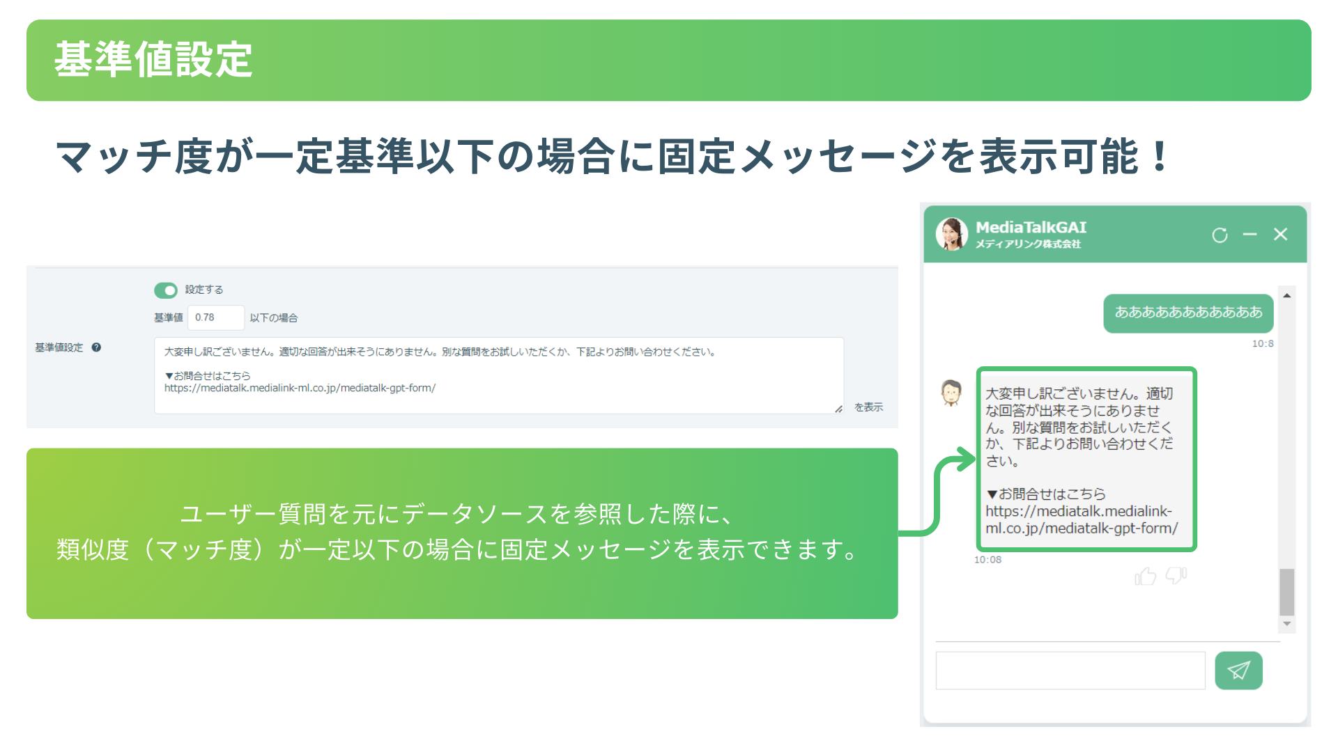 5.基準値設定:AI回答生成時にマッチ度が一定基準以下の場合、固定メッセージを表示できます。