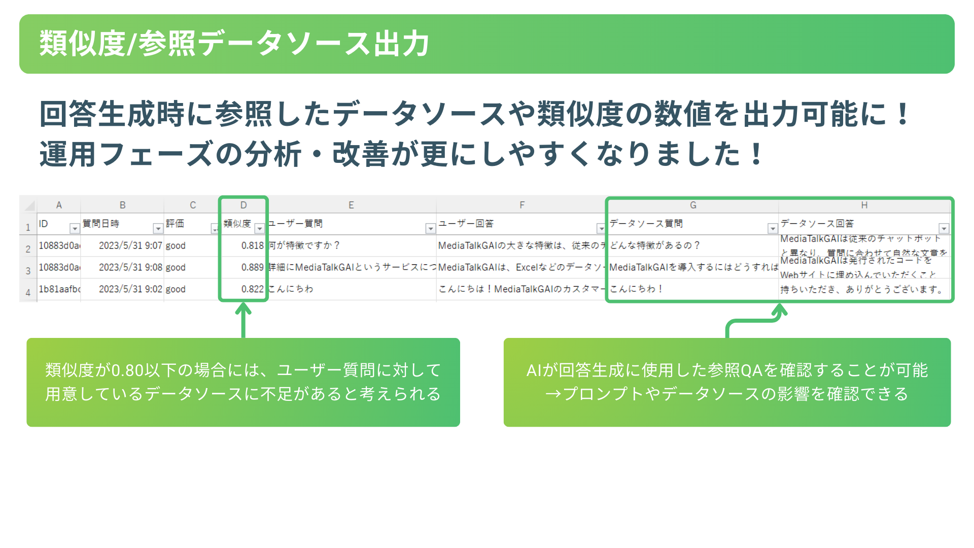 3.類似度/参照データソース出力:AIが回答生成時に参照したデータソースや類似度の数値を出力できます。