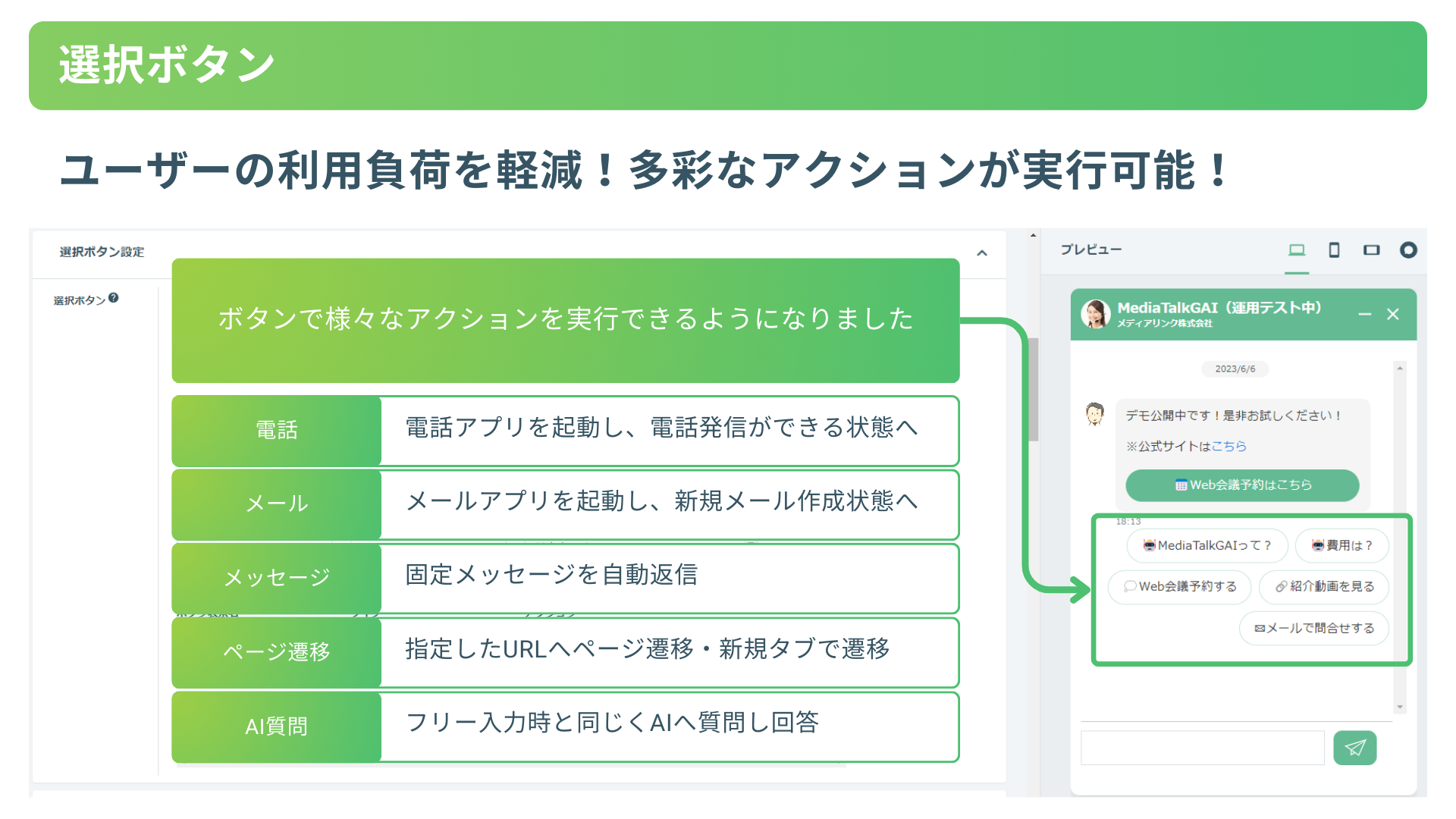 2.選択ボタン:選択肢表示によりユーザーの利用負荷を軽減します。多彩なアクションが実行可能です。