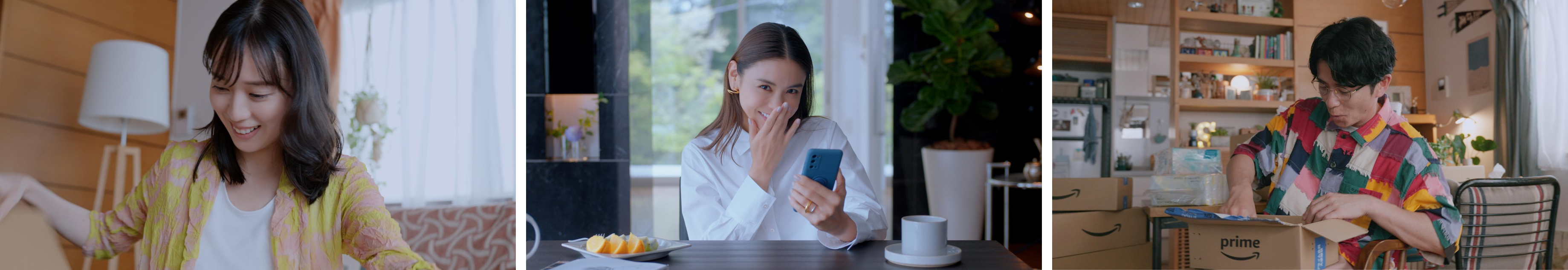 「“欲しい”が見つかるプライムデー」は、戸田恵梨香さん、滝沢眞規子さん、藤森慎吾さんが出演する全3話からなるWebムービーです。第1話では、隣人の藤森慎吾さんがAmazonで注文した商品を大量に抱えているのを見た戸田恵梨香さんがプライムデー開催に気付き、お買い物への期待が高まる様子を、第2話では、そんな戸田恵梨香さんと滝沢眞規子さんがビデオ通話をしながら、それぞれ欲しいものを夢中で探し、狙った商品を見せ合うなど商品選びの楽しさをリアルに描いています。第3話はいよいよ届いた商品の開封ですが、ここでサプライズが。撮影スタジオのチャイムが実際に鳴り、配達員からAmazonの段ボールを受け取った3人が、わくわくした様子で開けてみると・・・。気になるクライマックスはAmazon Japan公式のYouTubeチャンネルで公開中のムービー本編をご覧ください。