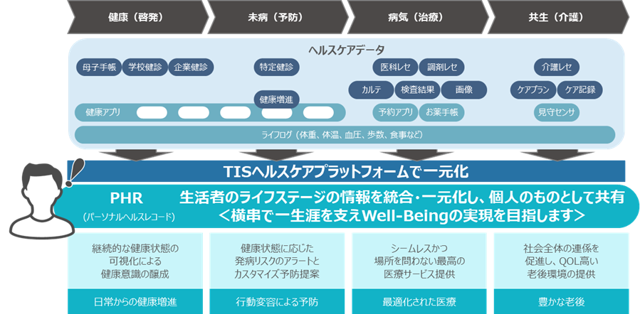 TISは事業を通じて解決をめざす社会課題の一つとして「健康問題」を掲げ、医療機関を中心に管理されている医療健康データを、健康増進に活用できるようにPHR※として整備するヘルスケアプラットフォームを提供しています。TISはヘルスケアプラットフォームを通じて培ったノウハウとデジタル技術を活かし、データ利活用のためのガイドライン整備に貢献するとともに、PHRサービスを提供するIT事業者として標準化を促進する役割を担う事で、PHRサービス産業の発展に貢献していきます。