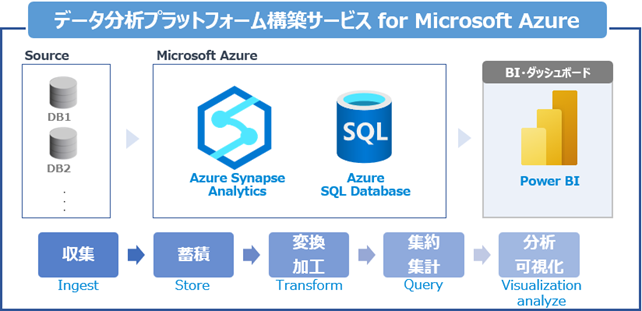 「データ分析プラットフォーム構築サービス for Microsoft Azure」は、Azure上にお客様のデータを収集・分析・可視化まで行える環境を構築し、お客様のデータ分析によるビジネスの成長を支援するサービスです。