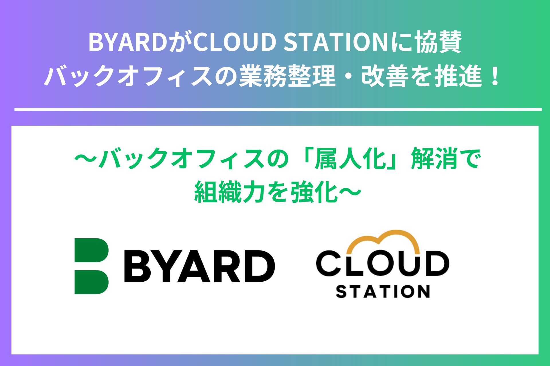 バックオフィス業務はプロセス全体が見えづらく、個々に対応していくうちに業務が属人化してしまいがちです。このバックオフィスを取り巻く永遠の課題 “属人化” を解消することによって組織力を高める仕組みがBYARDです。バックオフィスを良くしたいという両社の想いから、この度CLOUD STATIONに協賛いただく運びとなりました。