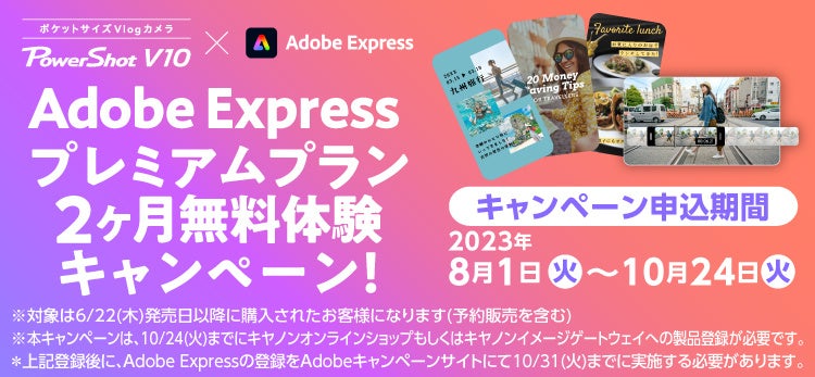 「Adobe Expressプレミアムプラン2ヶ月無料体験キャンペーン!」では、Vlogカメラ新製品「PowerShot V10」を購入された方を対象に、Adobe Expressのプレミアムプランを2ヶ月間無料で利用できるプロモーションコードをプレゼントします。