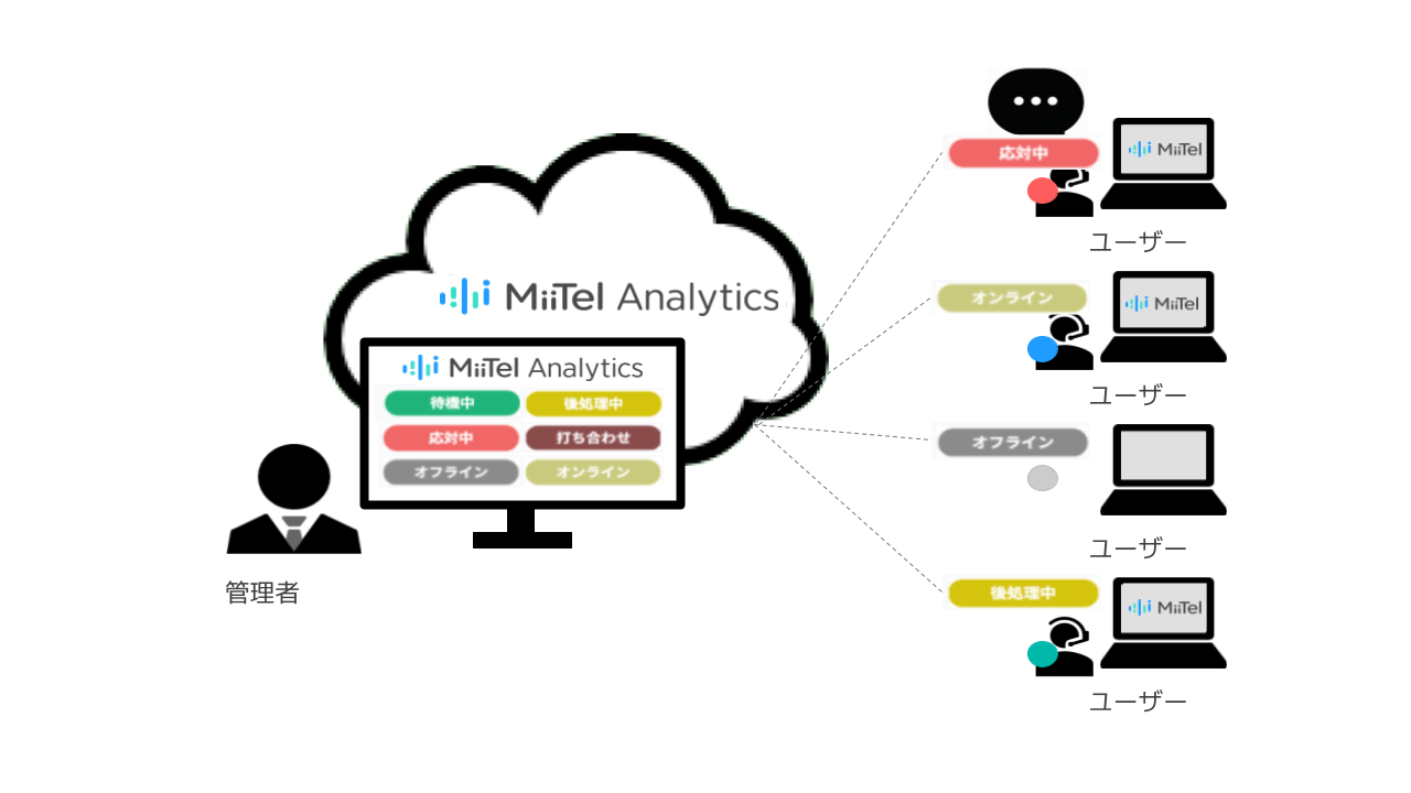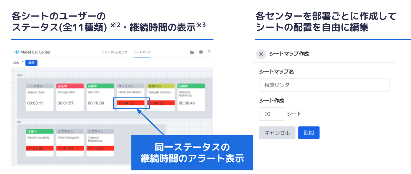 MiiTel Call Centerにはリアルタイムモニタとシートマップなどの機能があります。回線やユーザーのステータスをリアルタイムに確認でき、コールセンター運営の効率化に寄与します。