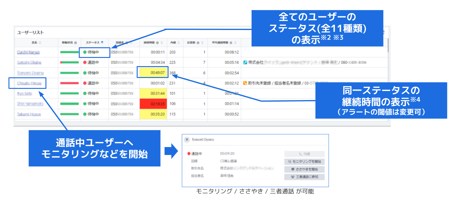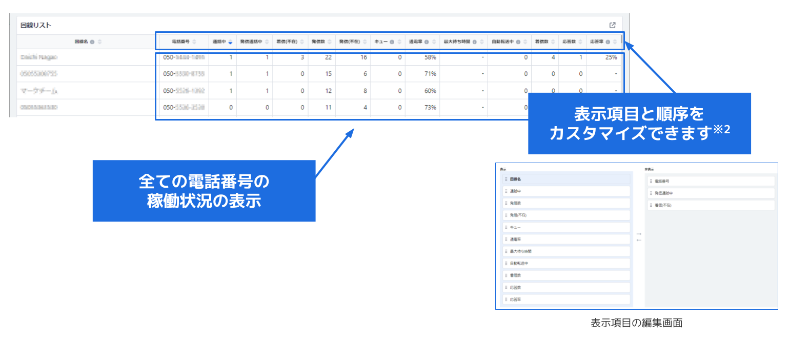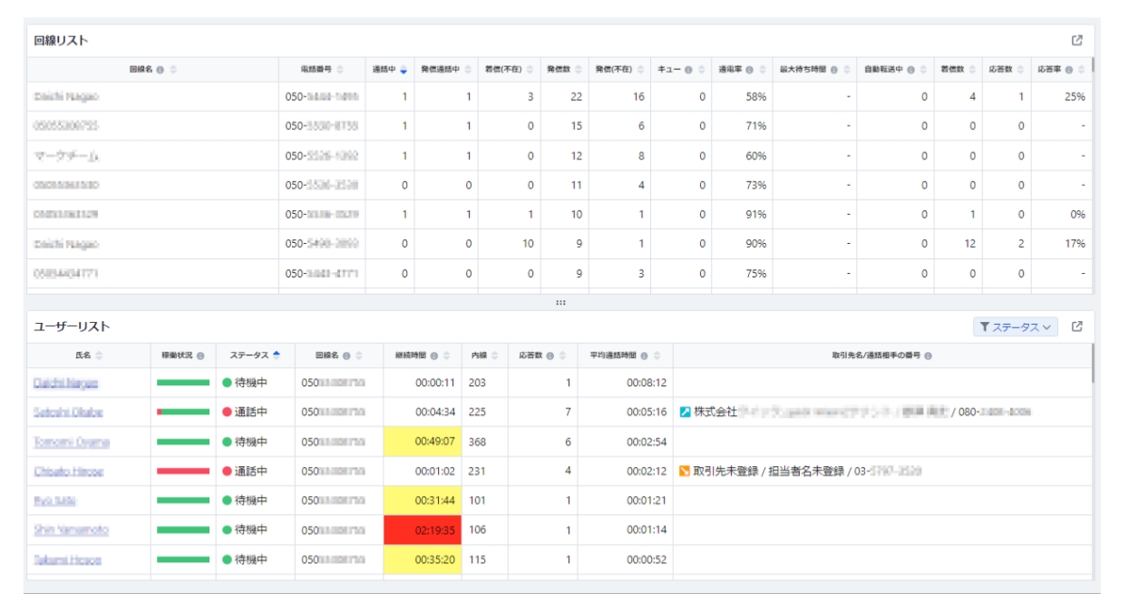 各電話番号の応答数や待ち呼数、各ユーザーのステータスを一覧で確認できます。