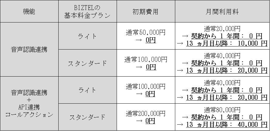 -BIZTELのオプション機能「音声認識連携」「音声認識連携 + API連携コールアクション(問い合わせ高精度要約モデル)」の初期費用と、契約から1年間の月間利用料を無償で提供。