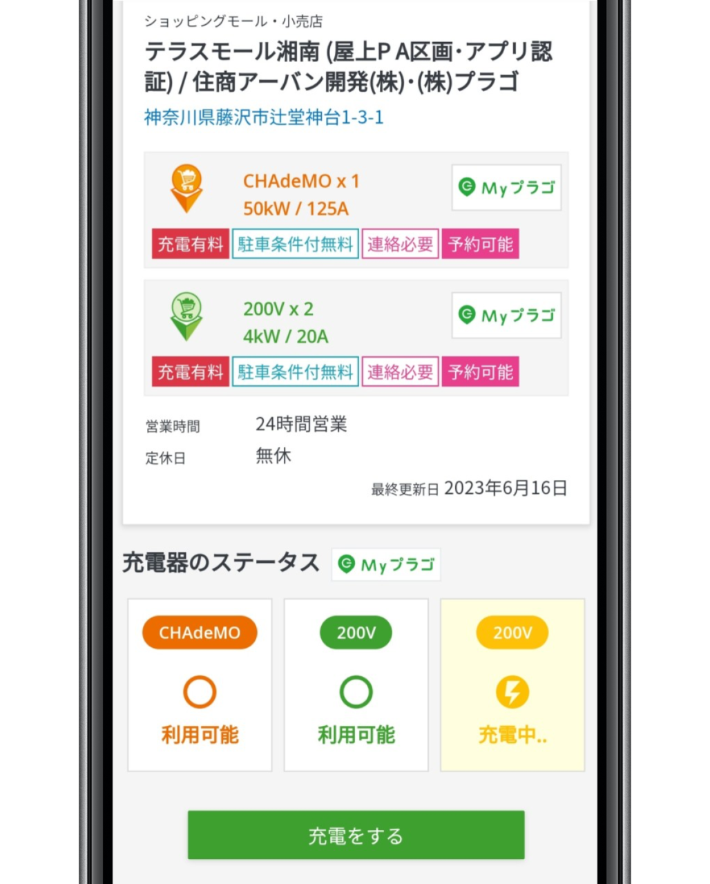Myプラゴの充電スポットを開くと、各充電器のステータス(利用可能、充電中など)がリアルタイムで表示され、GoGoEVからMyプラゴアプリのインストール不要で充電を開始することができます。