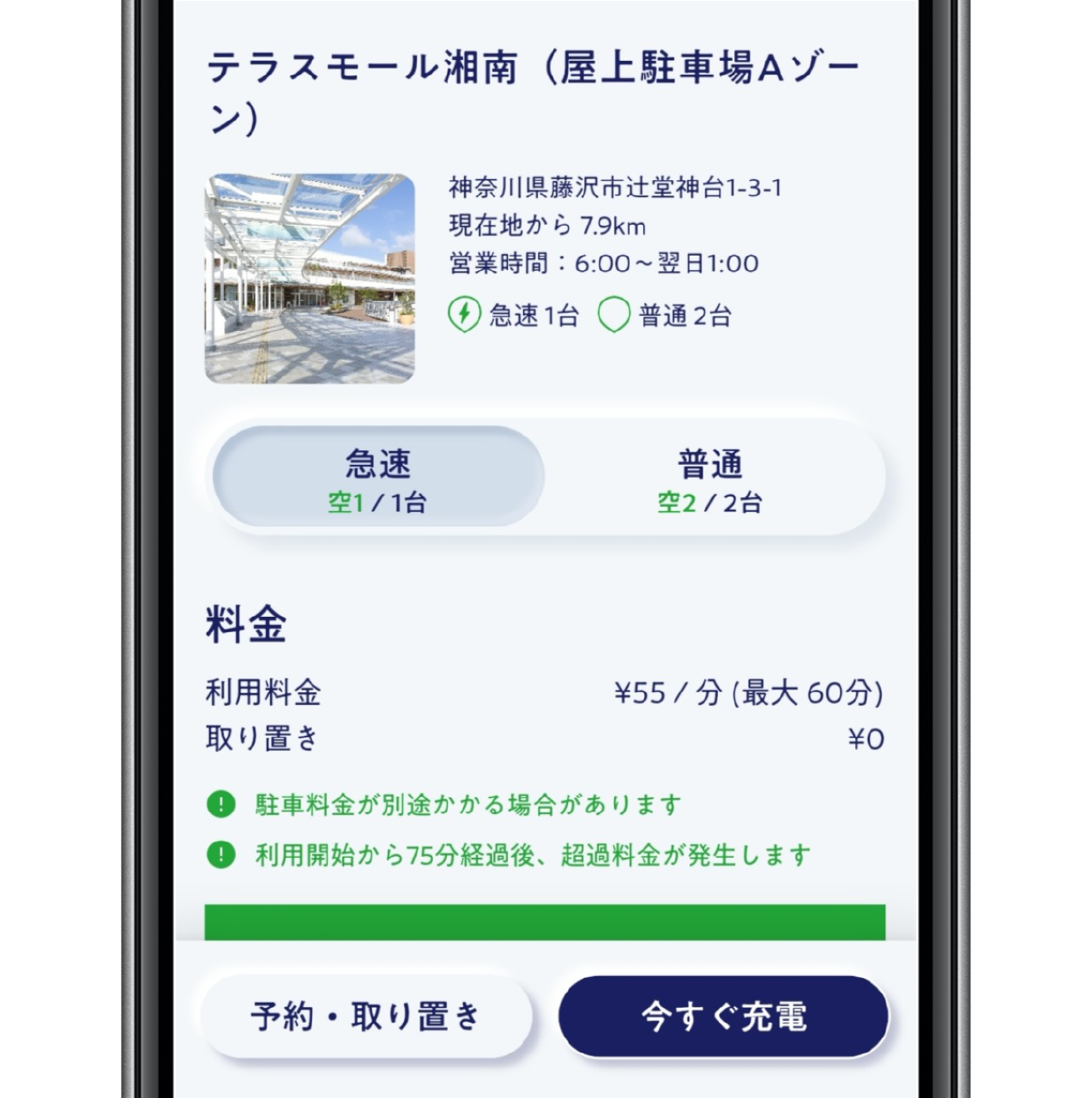 「今すぐ充電」をタップして、利用したい車室などを選択すると充電を開始することができます。