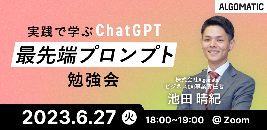 本勉強会は、ビジネス向けにChatGPT利用環境を提供する「ビジネスGAI」の開発元である生成AIスタートアップAlgomaticがプロンプトの基礎や仕組みを解説し、参加者の皆さまと一緒に実践しながらプロンプトのノウハウを共有できる場となっております。この勉強会は、ビジネスの現場で「実際に課題解決ができるプロンプトノウハウ」を「実践し試行錯誤しながら」身に着けることを目的としていますので、実際の現場で活用できるプロンプトを身に着けたい方、現状のプロンプトを洗練させたいという方は、業種に関係なくぜひご参加ください。