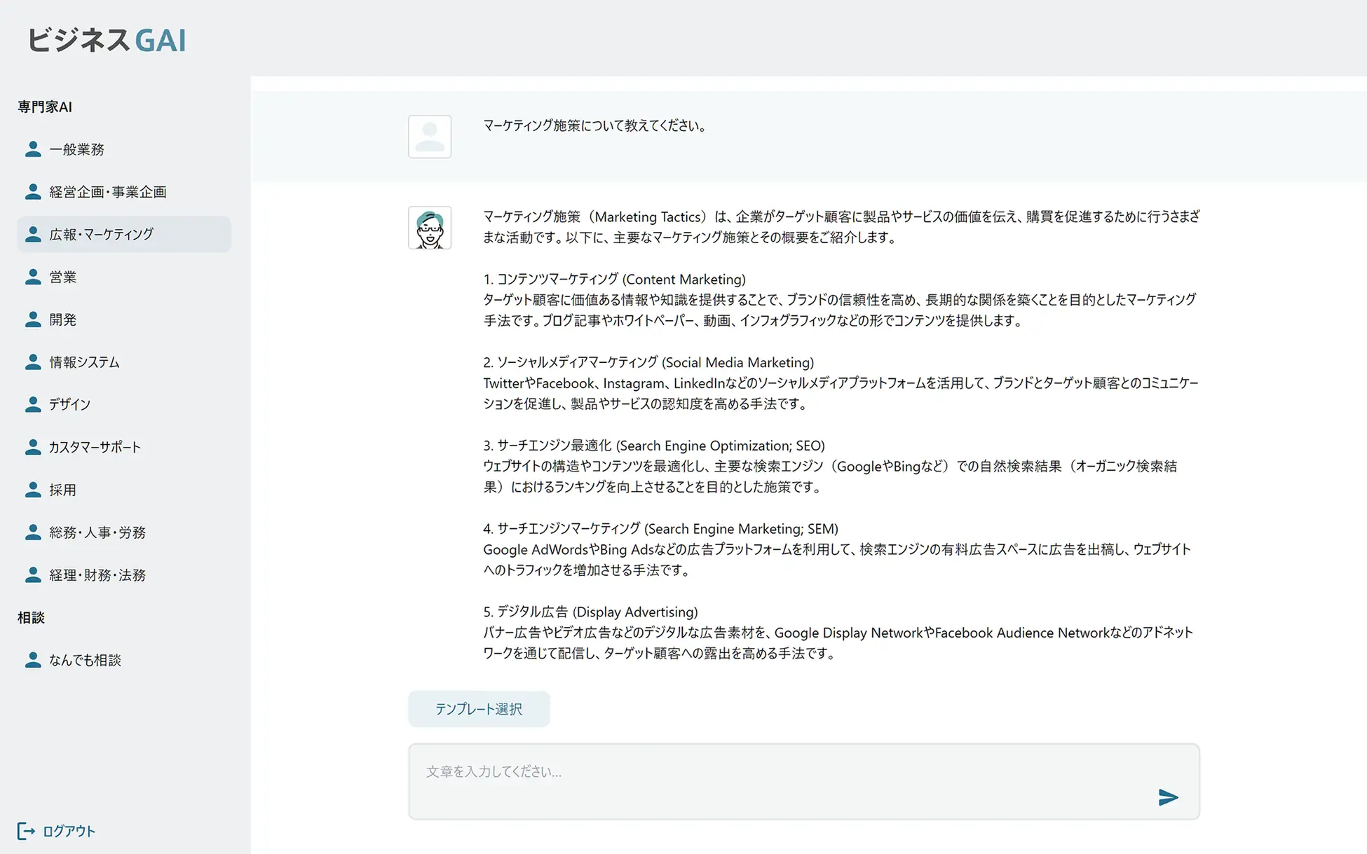 ChatGPTは用途が幅広い反面、使い慣れないユーザーにとっては、用途やプロンプト(入力する文章)が明確でないことで、利用しにくい状況がありました。「ビジネスGAI」では、ビジネス成果が出るユースケースを元に、ChatGPTに「専門家AI」という形で特定のペルソナを与え、ユーザーにとってより使いやすくかつ精度の高い回答を実現します。
