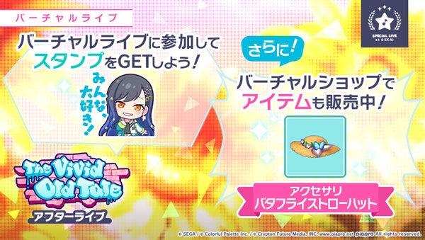 また、「The Vivid Old Tale アフターライブ」の開催に先立ち、7月11日(月)からバーチャルショップにて、アクセサリ「バタフライストローハット」を販売中です。