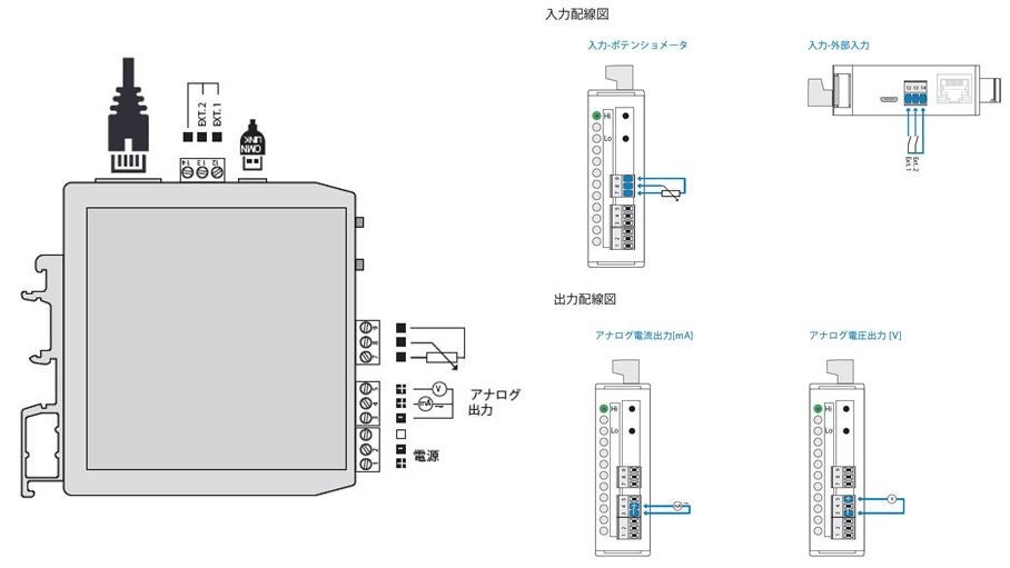 ポテンショメータの抵抗値を入力し、アナログ信号(電圧/電流)やMNI Link接続で出力可能な信号変換器です。