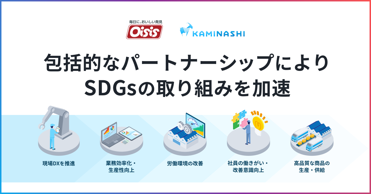 オイシス様はすでに導入いただいている工場での成果や価値を感じて、このたびパートナーシップ契約締結を決断してくださいました。それは、単なる業務時間や紙の削減だけにとどまらず、導入を担当されたオイシス社員の方々のデジタル化や現場改善への意識が高まったことなど、組織的な改革への期待も込めていただいています。本取組みが、カミナシが掲げるSDGs 目標やビジョンに共感いただけたものだと大変嬉しく思っています。
