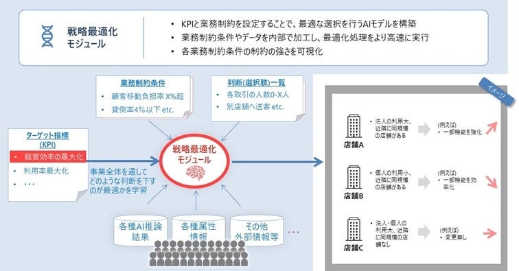 本取組において、セカンドサイトアナリティカが培ってきたAI・最適化技術を活用し、各市区町村の人口動向予測・取引種別の需要予測を行い、併せて、店舗ごとに配置すべき人数や備えるべき機能を適正化します。特に最適化部分ではセカンドサイトアナリティカが独自に開発した、店舗ごとに取りうる各アクションの結果を加味しつつ、目標とする指標を最大化する「戦略最適化モジュール」を活用いたします。