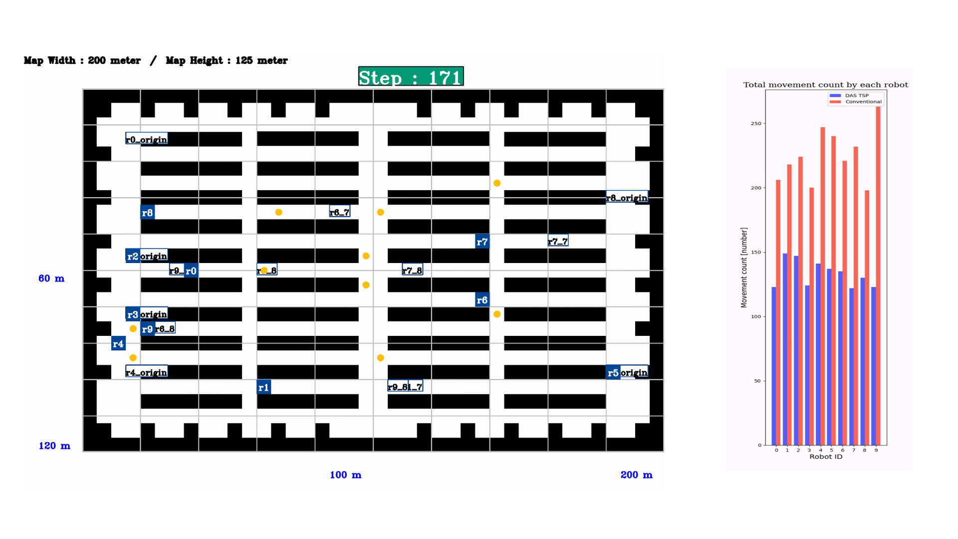 左:シミュレーションのイメージ、右:各ロボットの移動距離を示したシミュレーション結果(10台のAMRすべてにおいて、従来の手法と比べて移動量が下回っていることが確認できる)