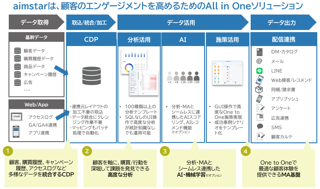 弊社が提供するEngagement Data Platform(EDP)「aimstar」は、BtoC企業が保有する様々なデータを活用し、顧客(生活者)とのエンゲージメント強化実現に向けた機能追加、改善を2004年のリリース以降で実施してまいりました。結果として⽇本を代表する数多くのBtoC企業様への導⼊が進んでまいりました。今後は、既に提供しているAI機能の提供価値向上に加え、BtoC企業が立案する顧客(生活者)とのエンゲージメント方針、予算などの変数に応じた最適なエンゲージメント向上施策のレコメンド、施策実行結果のモニタリング強化など、ノウハウ面をaimstarに実装していくことを考えております。