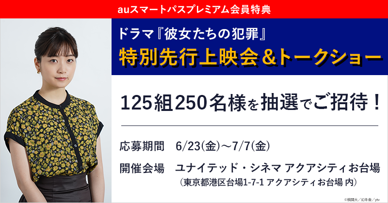 ドラマ「彼女たちの犯罪」は、読売テレビ・日本テレビ系の「プラチナイト」枠(木曜午後11時59分)で放送される、23年7月期の連続ドラマです。俳優の深川麻衣さんが日本テレビ系のドラマで初めて主演を務め、前田敦子さんと石井杏奈さんも出演します。 “普通の幸せ”を渇望した3人の人生が、ある失踪事件をきっかけに、思いもよらぬ方向に進んでいくスリリングなサスペンス作となっています。先行上映会には、主演の深川麻衣さんが登壇予定!上映後にはトークイベントタイムを設けており、作品への想いや制作現場の様子などをお話いただきます。