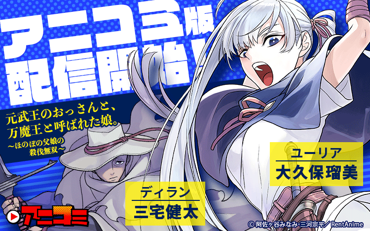 この度、マルチデバイス対応電子書籍レンタルサイト「Renta!」(https://renta.papy.co.jp/)では、マンガをフルカラー化し、モーションと声優によるボイスを付加した、次世代コンテンツ「アニコミ」の新シリーズ『元武王のおっさんと、万魔王と呼ばれた娘。~ほのぼの父娘の殺伐無双~』の配信を開始いたしました。