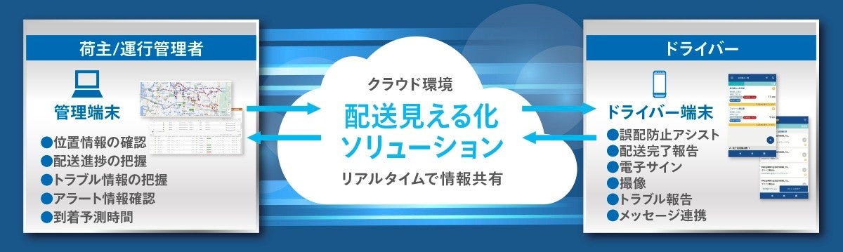 「配送見える化ソリューション」を既存の基幹システムとリアルタイムに連携。荷物単位での配送ステータスの管理、電子サインによる受領エビデンスの取得、ドライバーと事務所間での集配指示やメッセージのやりとりが可能となります。ドライバーへの電話確認業務などを大幅に削減し、集配業務全体の効率化を実現します。