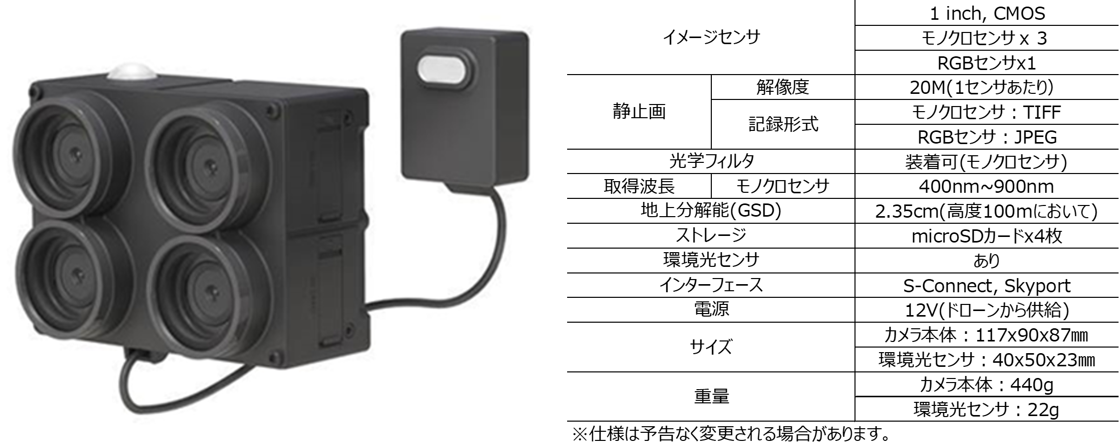 なお、本製品は、国立研究開発法人農業・食品産業技術総合研究機構(農研機構/NARO)が事業実施主体である国際競争力強化技術開発プロジェクトの「安全安心な農業用ハイスペックドローン及び利用技術の開発(*1)」を受託(2021年6月)したハイスペックドローン開発コンソーシアム(*2)の事業において、農作物の生育状況を見える化し、圃場管理に役立つ画像を効率的に撮影する農業のDX化推進に貢献するセンシング用カメラとして開発したものです。