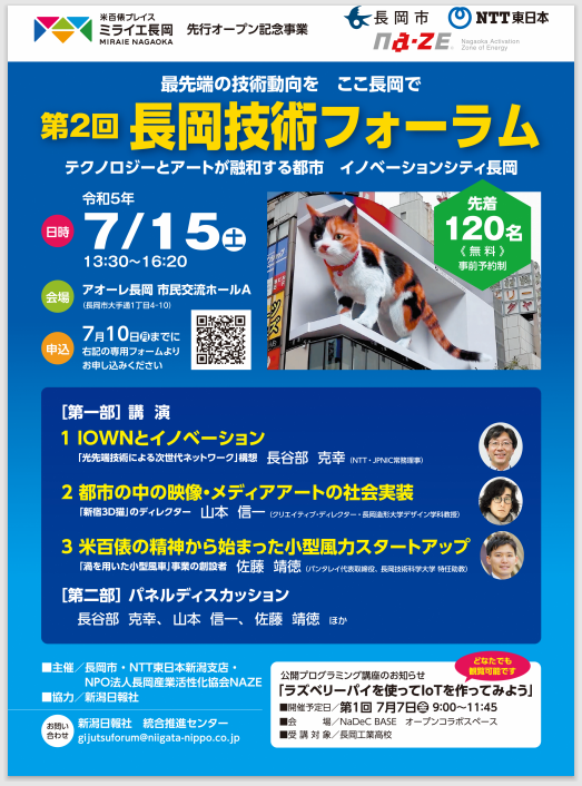 この度、第2回目の「長岡技術フォーラム」を開催し、長岡市におけるDX人材の更なる裾野の拡大を図ります。当日は、長岡市出身で、新宿駅の街頭ビジョンで放映している3Dの巨大猫を手掛けたクリエイティブ・ディレクター山本信一氏の県内初講演をはじめ、デジタル社会を牽引する技術者や長岡発の起業家が一堂に会します。