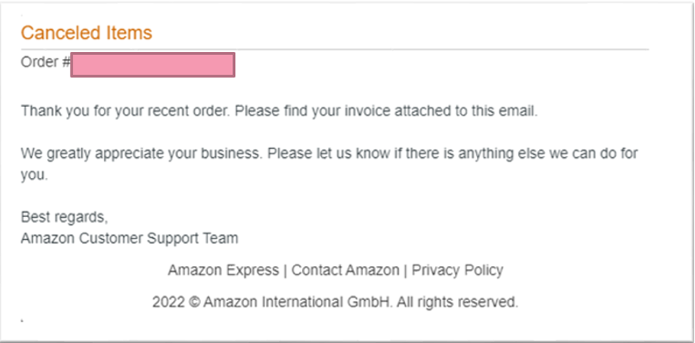 以下の電子メールには、支払いの問題によって注文がキャンセルされた旨が記載されています。しかし、このメールにはISOイメージファイルが添付されており、これを開くと受信者のコンピューターに実行可能なマルウェアドロッパーが残されます。