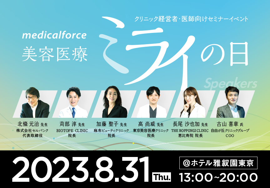 本イベント「美容医療ミライの日」は”これからの美容医療を担う医師・経営者のための、業界の現在地と未来を語り尽くす特別な一日”をコンセプトに、自由診療クリニック経営者・医師が集い、”これからの美容医療業界”や”これからの美容クリニック経営”について様々な角度から学びを深め、語ることのできるイベントです。