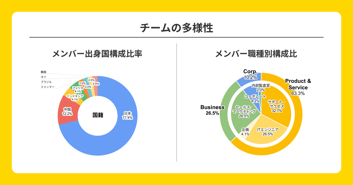 メンバーの7割が日本出身、3割は中国やアメリカ、韓国やミャンマーなど多国籍なメンバーが集まっています。チーム別に見てみると「サポート・サクセス」が多く、海外ユーザーとの接点に重点があることがわかります。