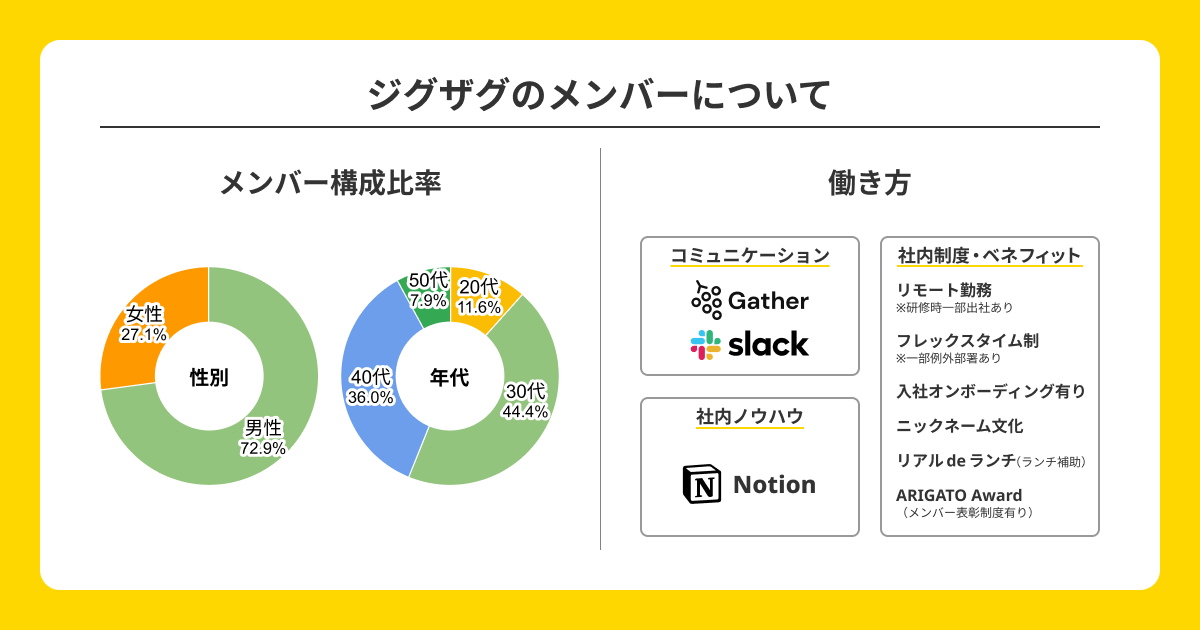 メンバーは30代を中心に、男女比は7:3ほどです。グローバルカンパニーを目指すジグザグは、働き方もスタートアップらしさと中堅企業としてのバランスを保ち、メンバーの「働きやすさ」「サービスに向き合える環境」をつくっています。