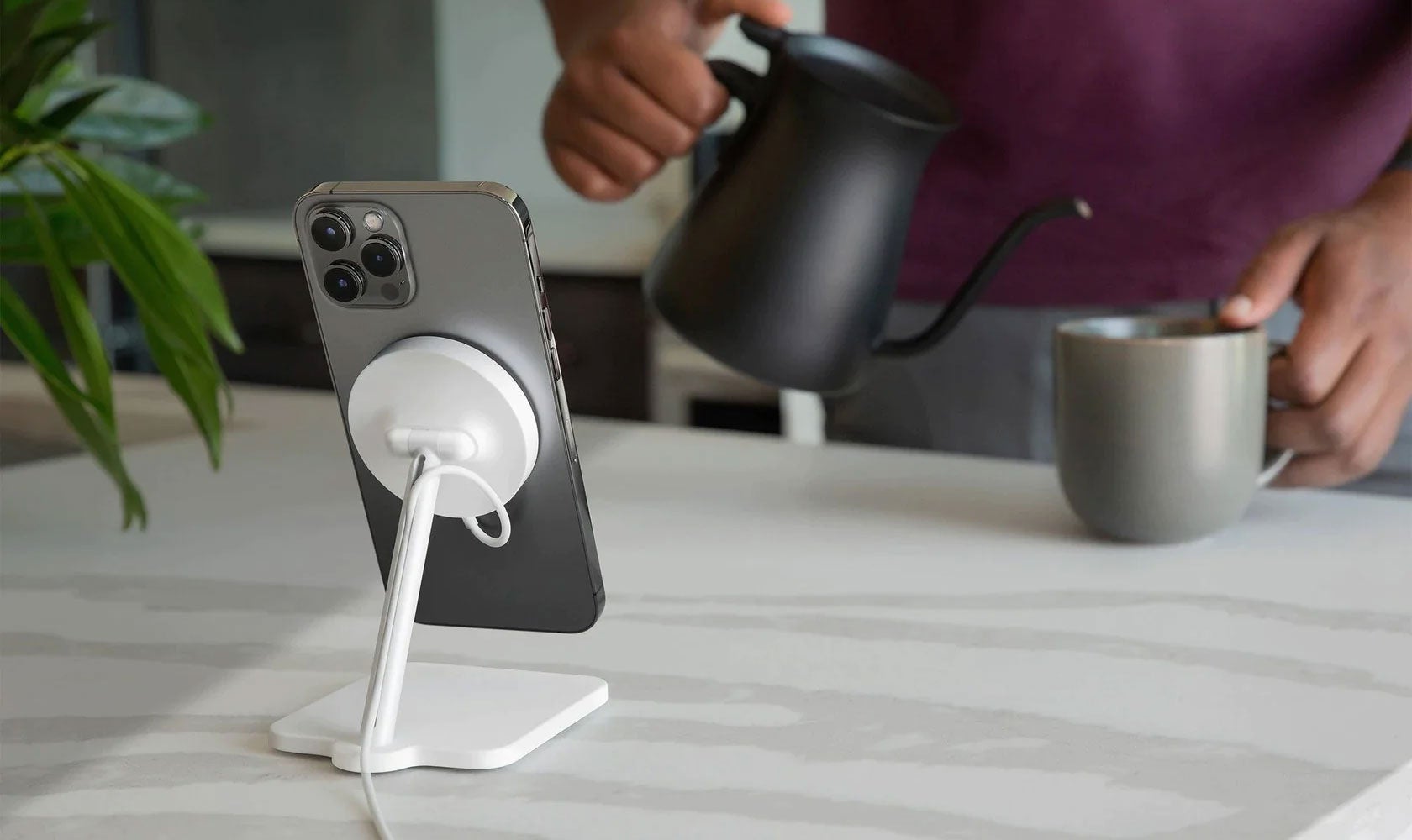 Forté for iPhoneは、AppleのMagSafe充電器専用のモダンなルックスのワイヤレス充電iPhoneスタンドです。お手持ちのMagSafe充電器をFortéにはめ込むだけで、iPhone 12、13、14を設置しながら15Wの高速ワイヤレス充電ができます。磁石でiPhoneを固定しているので、縦にも横にも使用できます。さらに、土台の首が最大70度まで傾くので、お好みの角度で見ることも、AirPodsを上に置いて充電することも可能。旅行などの外出時にも、FortéからMagSafe充電器を簡単に取り外せるので、持ち運びに手間がかかることはありません。※本製品に、MagSafe充電器は付属されません。
