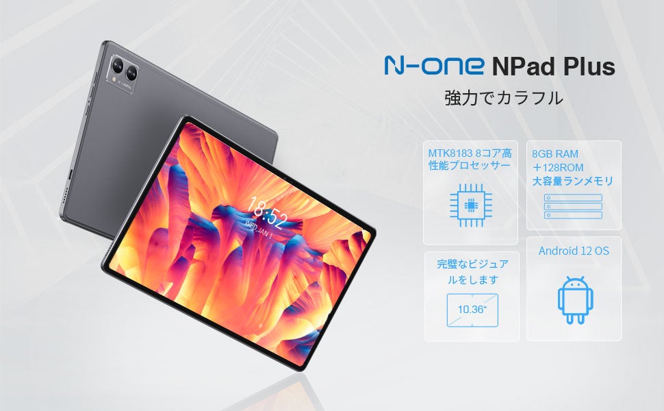 Npad PlusはN-ONEが発売する、オフィス・生活・学習のニーズに最大限応える、超ハイコストパフォーマンスを重視したタブレットパソコンです。 日常使いのスムーズさと高品質を追求しながらも、買い手は損をせず、売り手は節約できるよう、大衆に受け入れられやすい価格を維持しています。 10.4インチ Wi-Fi モデル、Andorid 12 オペレーティング システム、MTK 8183 8 コア CPU 2.0GHz、8GB+128GB+1TB 拡張可能、10 インチ 2K FHD IPS ディスプレイ、解像度 2000×1200 13MP/5MP + Bluetooth 5.0+GPS+2.4G / 5G WiFi + OTG + 6600mha + GMS。 詳しい設定についてはhttps://www.amazon.co.jp/dp/B0C1WFTCPVをご参照ください。