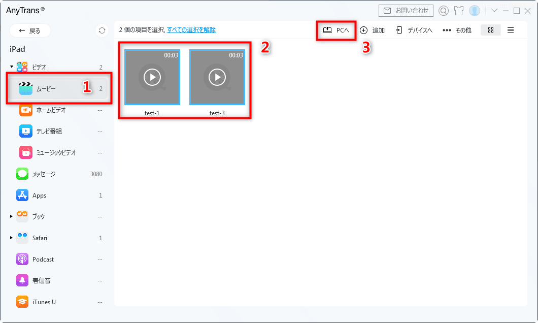 ステップ1、AnyTransを起動し、iPadを接続して、識別されたら右上の「ビデオ」をクリックします。