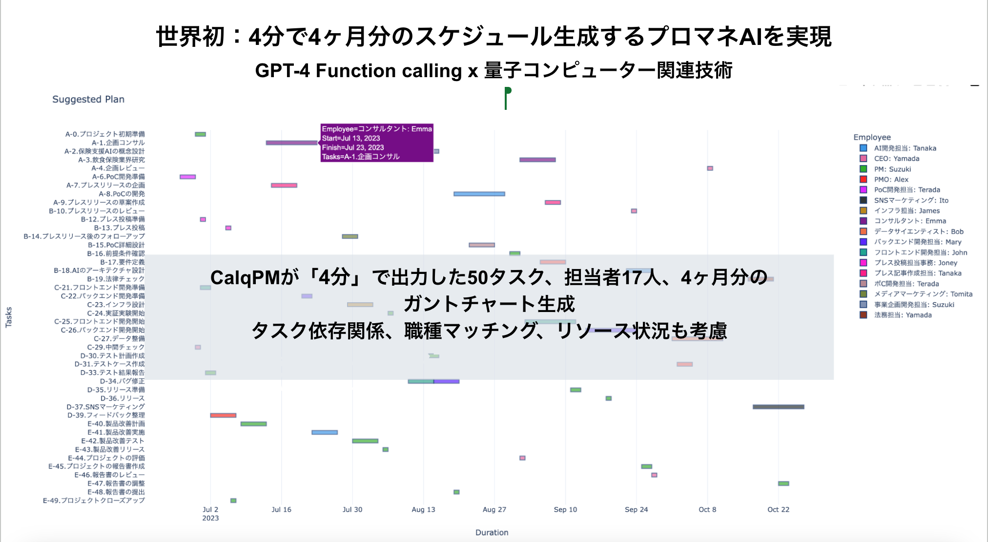 *世界初:6/25日時点当社調べ 但しLLM, GPT, 量子コンピューター, ガントチャート, マネジメントなどのキーワードでGoogle 検索エンジンやgoogle scholarなどでGPT Function callingと量子関連技術でガントチャート生成を行う事例を検索。