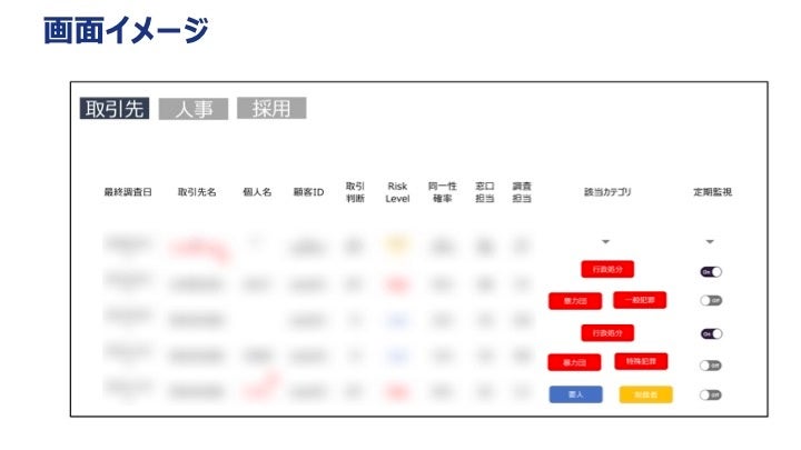今回の新機能により、KYCCのサービスのご利用者様は、人物名・法人名を画面に入力する、あるいはAPI接続することのみで、包括的な情報網から容易に行政が公表するリスク情報を確認いただくことが可能となります。