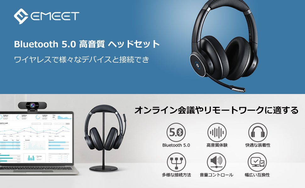 EMEETヘッドセット HS150は、USB接続がもちろん、Bluetooth5.0とドングルで安定的で快適なワイヤレス接続ができ、PC、デスクトップ、タブレット、携帯電話など様々なデバイスで利用可能である。