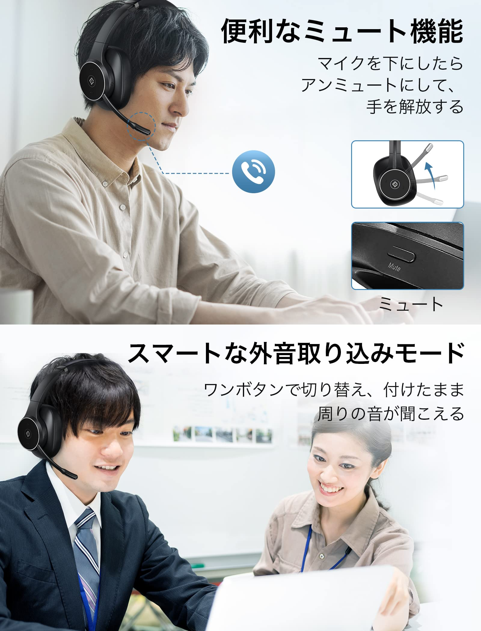 EMEETヘッドフォンHS150は、マイクを上にしたらオン、下にしたらミュートを解除する使い勝手がよいミュート機能が付き、手間がかからない。それに、左側のlogoを押すと外音取り込みモードに切り替え、ヘッドセットを付けたままでも周りの音が聞こえるため、ヘッドセットを外さずに、仕事同士と話せる。1年間のメーカー保証が付いておりますので何かご質問あればご連絡下さい。