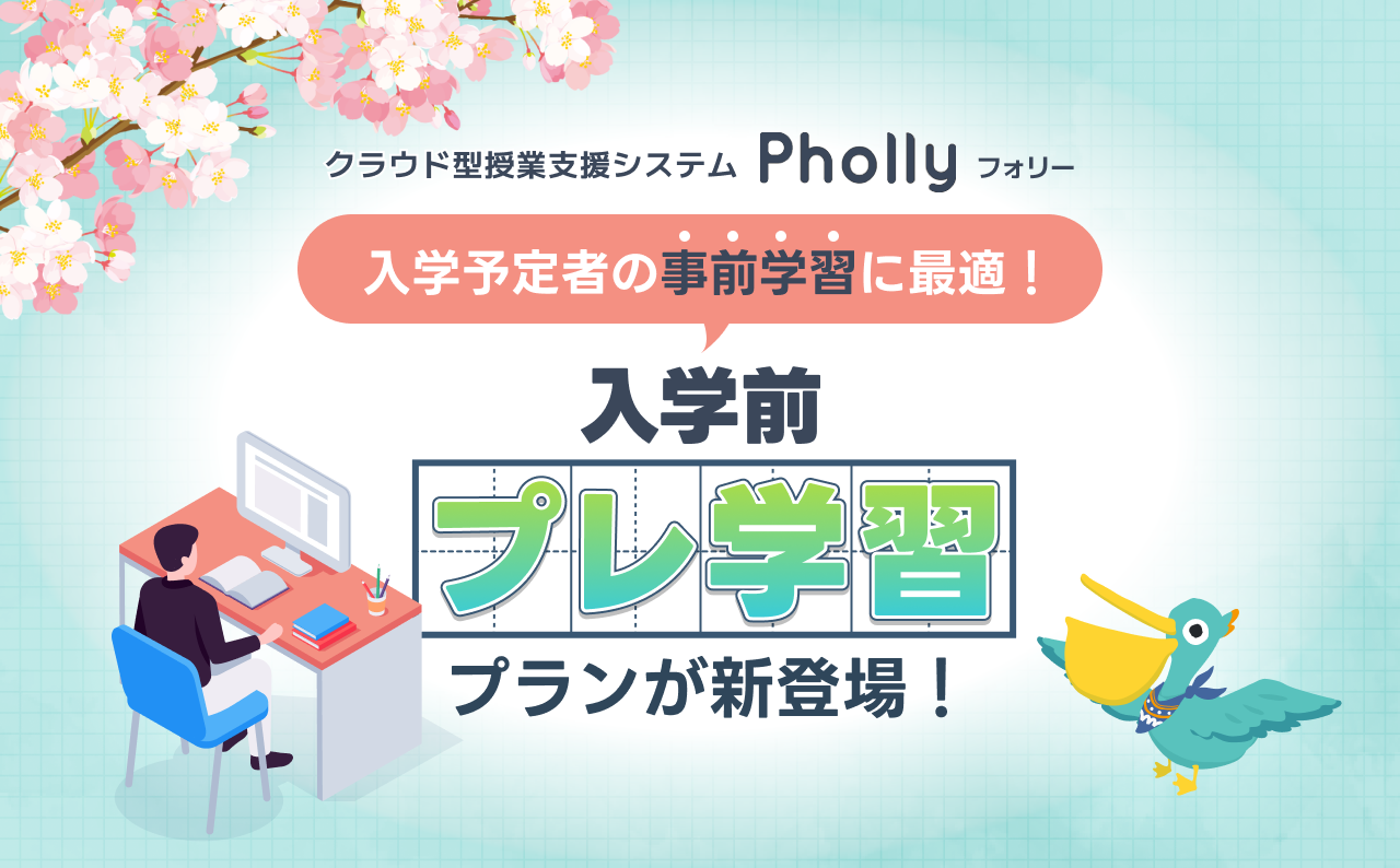 「入学前プレ学習プラン」は、推薦入試や総合型選抜が終わり入学までの期間にあわせて11月から4月までの6か月間、Phollyを利用できる新プランです。Phollyのシステムを使用することで入学前プレ学習を効率的に実施できます。また、ライトプランの機能に加えてテスト機能が利用可能です。