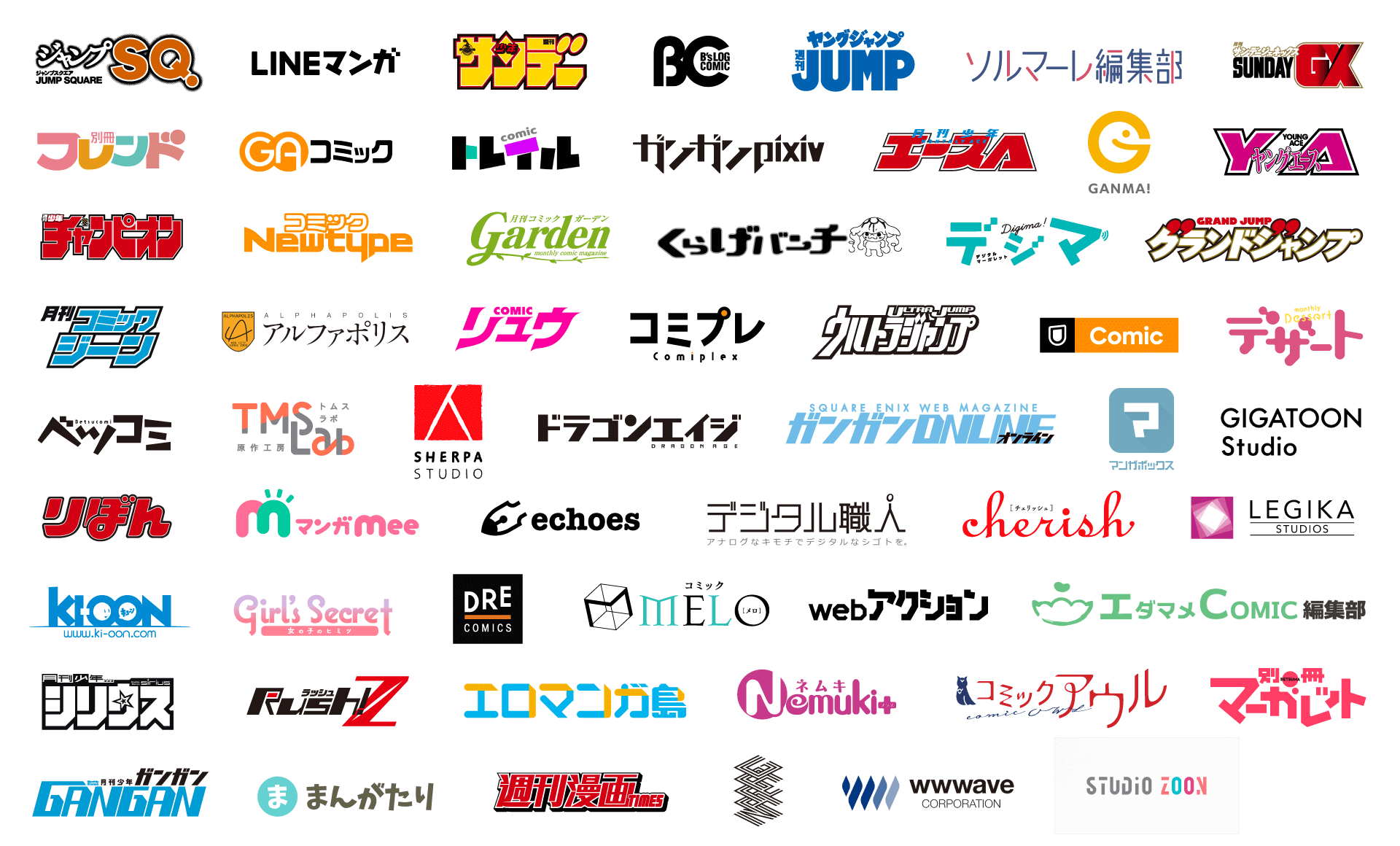 ジャンプSQ. / LINEマンガ / 週刊少年サンデー / コミックビーズログ / 週刊ヤングジャンプ / ソルマーレ編集部 / サンデーGX / 別冊フレンド / GAコミック / コミックトレイル / ガンガンpixiv / 少年エース / GANMA! / ヤングエース / 週刊少年チャンピオン / コミックNewtype / 月刊コミックガーデン / くらげバンチ / デジタルマーガレット / グランドジャンプ / 月刊コミックジーン / アルファポリス / COMICリュウ / コミプレ / ウルトラジャンプ / U-NEXT comic / デザート / ベツコミ / TMSLab / シェルパスタジオ / ドラゴンエイジ / ガンガンONLINE / マンガボックス / GIGATOON Studio / りぼん / マンガMee / echoes / デジタル職人 / チェリッシュ / レジカスタジオ / Ki-oon / 女の子のヒミツ(Girls Secret) / DREコミックス / コミックMELO / webアクション / エダマメ / 月刊少年シリウス / Rush!Z / エロマンガ島 / Nemuki+ / コミックアウル / 別冊マーガレット / 月刊少年ガンガン / まんがたり / 週刊漫画TIMES / GARAN / ウェイブ / StudioZOON
