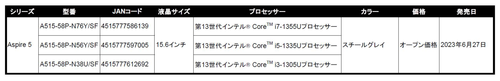 日本エイサー株式会社(本社:東京都新宿区、代表取締役社長:ボブ・セン)は、基本性能をおさえたスタンダードノートパソコン Aspire(アスパイア)シリーズより、Aspire 5の新モデル3機種「A515-58P-N76Y/SF」「A515-58P-N56Y/SF」「A515-58P-N38U/SF」を2023年6月27日(火)に発売します。フルHD解像度15.6インチディスプレイ搭載で、ドキュメント作成などのベーシックな使い方から簡単な画像の編集、クリエイティブな作業までCPU違いで用途に合わせて選べる3機種をラインアップ。すべてテンキー付きで、数字入力も楽に行える新モデルです。本製品群はビックカメラグループ、ヨドバシカメラ、Joshin、Acer公式オンラインストアにて販売します※。