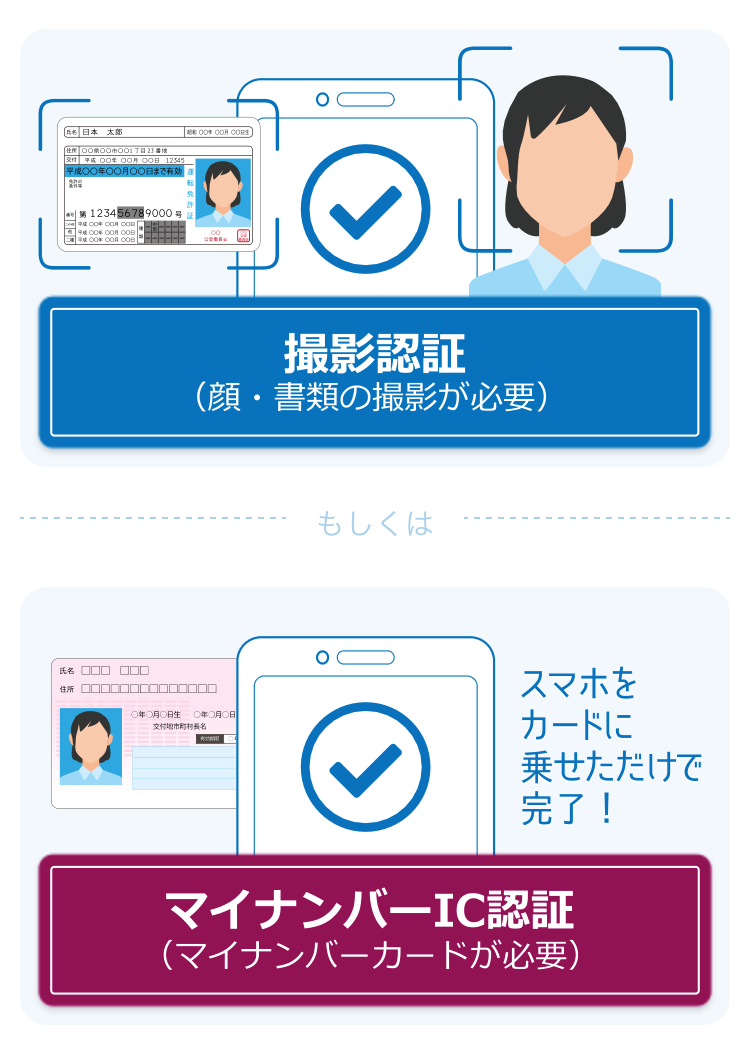 従来までの本人容貌・免許証・ランダム画像等を撮影する犯罪収益移転防止法に準拠した本人確認に加え、マイナンバーカードのICチップを活用した公的個人認証も可能になります。