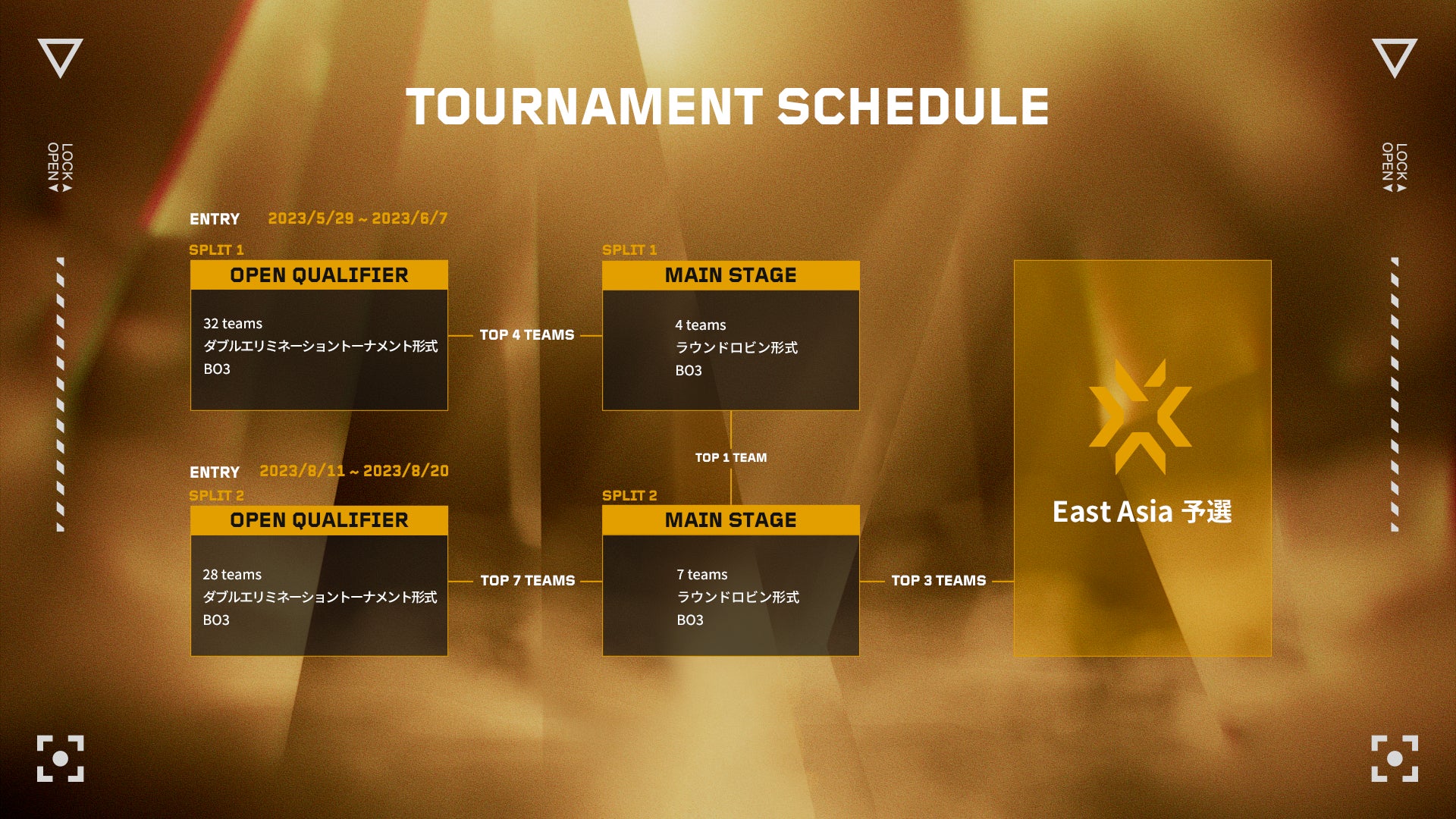 「Split 1 Open Qualifier」では、25チームが4つのグループに分かれ、ダブルエリミネーショントーナメント形式(BO3)で争います。各グループを勝ち抜いた4チームが7月28日(金)〜7月30日(日)に行う「Main Stage」に進出します。