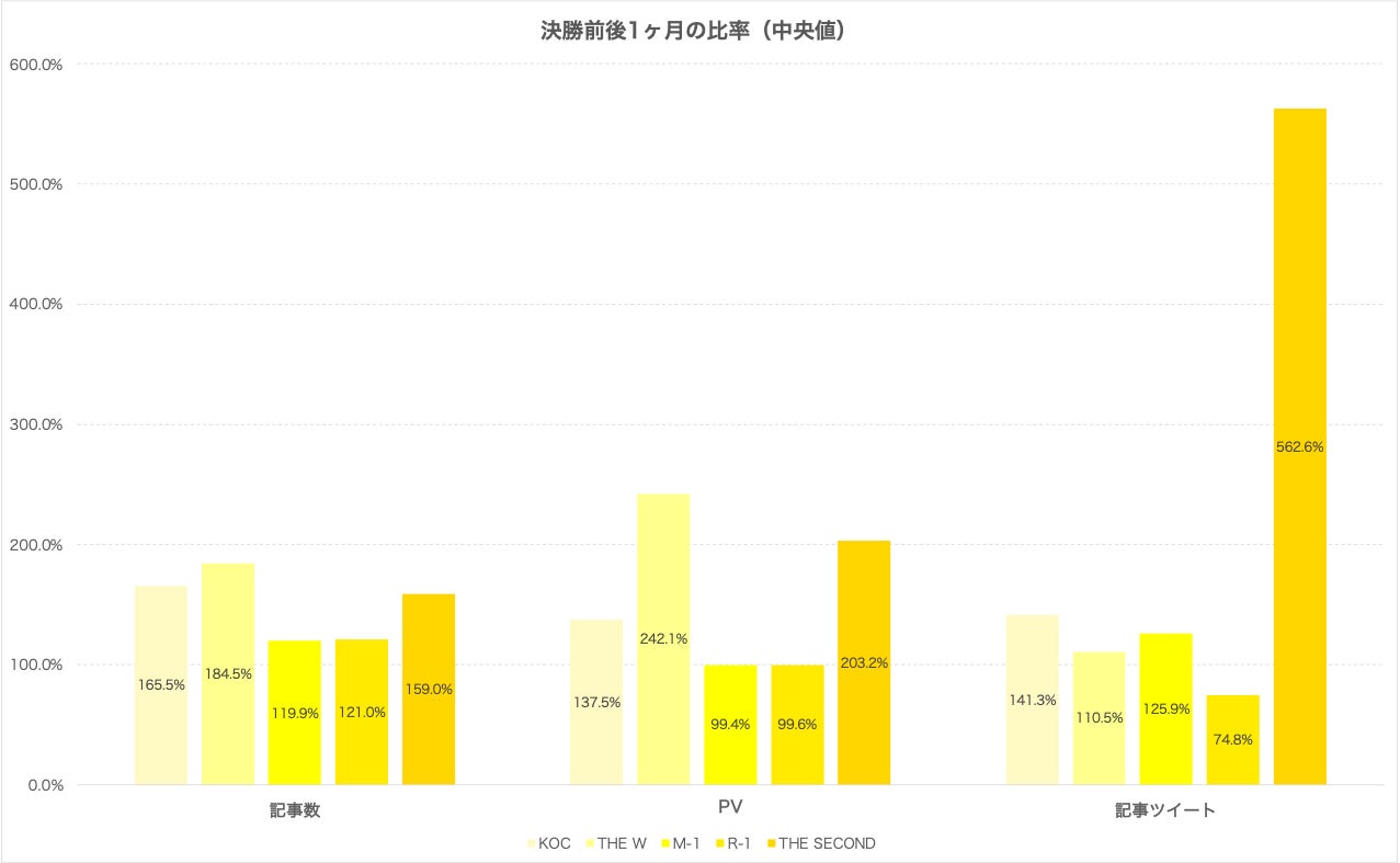 ・ただし決勝前の数字では、PVと記事ツイート数はより低めの位置でした。逆にこの2項目は決勝後の伸び率が大きくなっています。これは今回のTHE SECONDが初開催であるために、決勝までの期間は注目が集まりにくく、実際に決勝の放送を経て話題が増えていったことを示しています。
