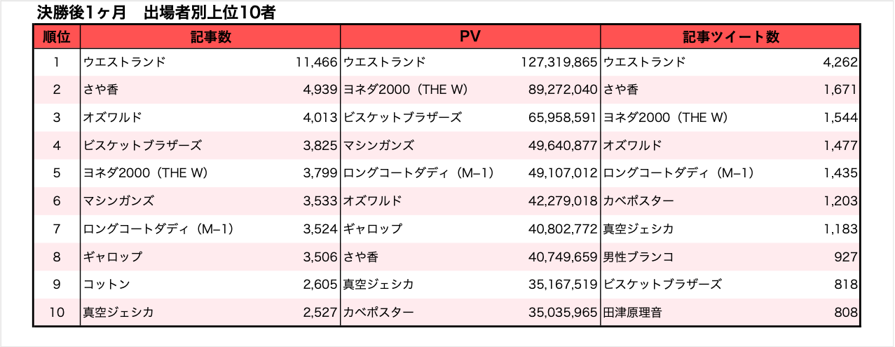 調査対象:上記大会決勝進出者の名前(コンビ・トリオはその名前)を含むウェブニュース記事