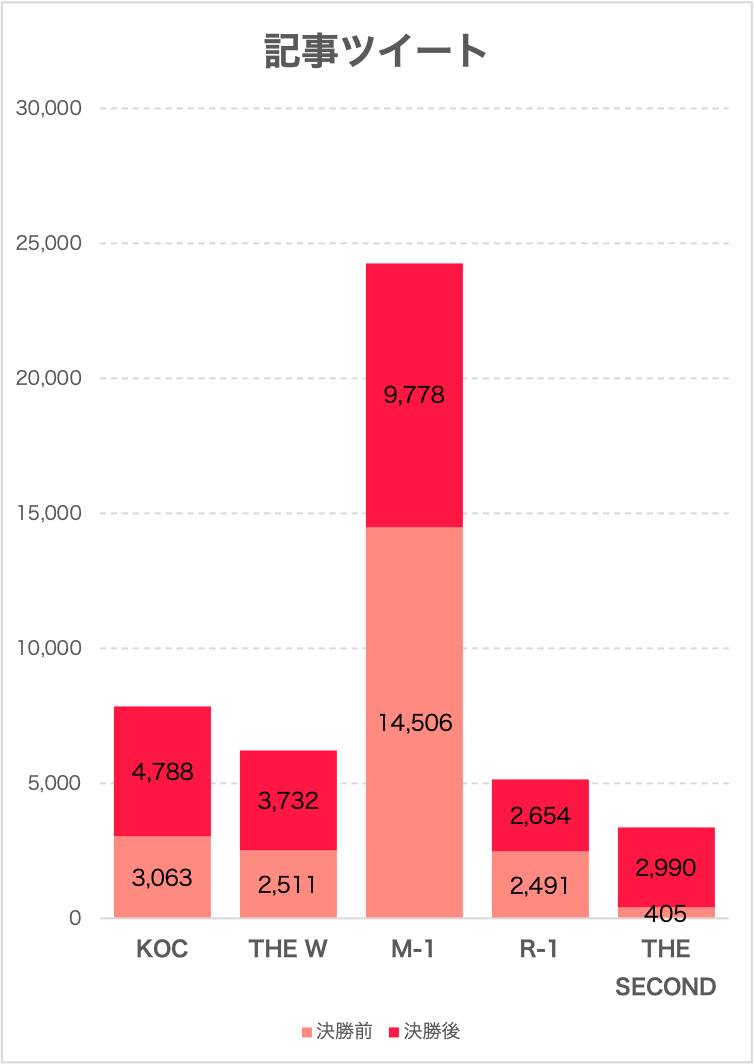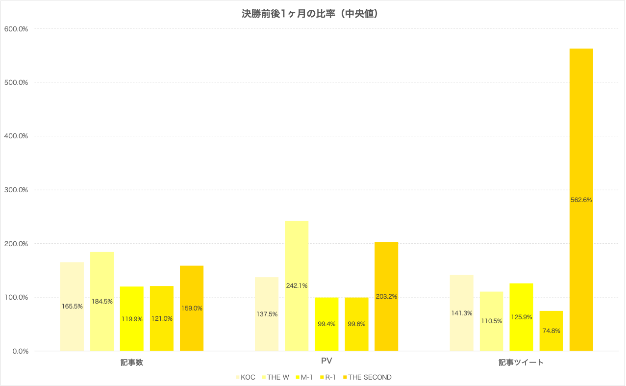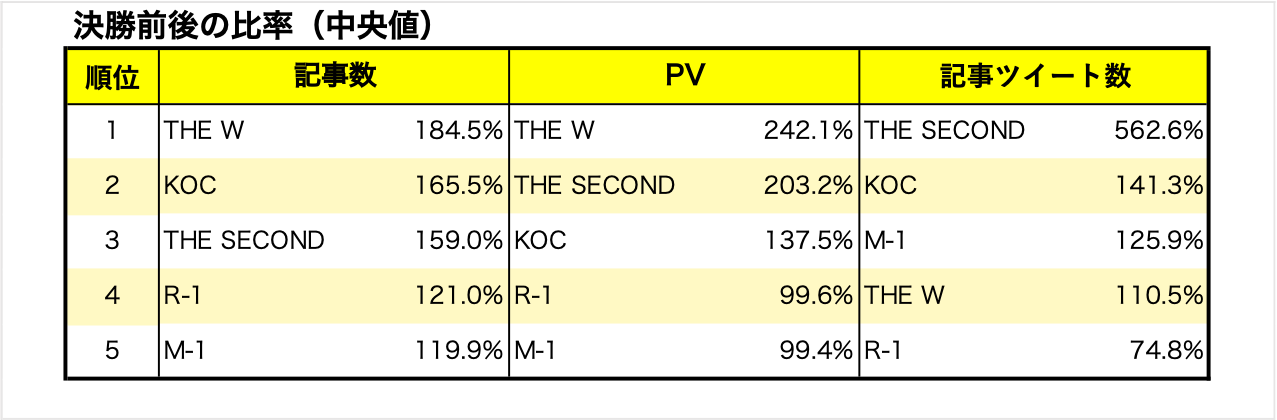 ・ただし決勝前の数字では、PVと記事ツイート数はより低めの位置でした。逆にこの2項目は決勝後の伸び率が大きくなっています。これは今回のTHE SECONDが初開催であるために、決勝までの期間は注目が集まりにくく、実際に決勝の放送を経て話題が増えていったことを示しています。